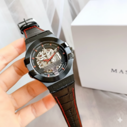 Maserati Men’s Automatic Skeleton Watch – Black Case, Leather Strap with Red Stitching