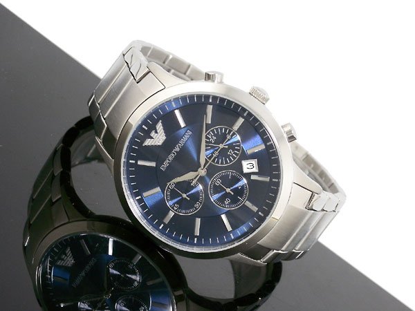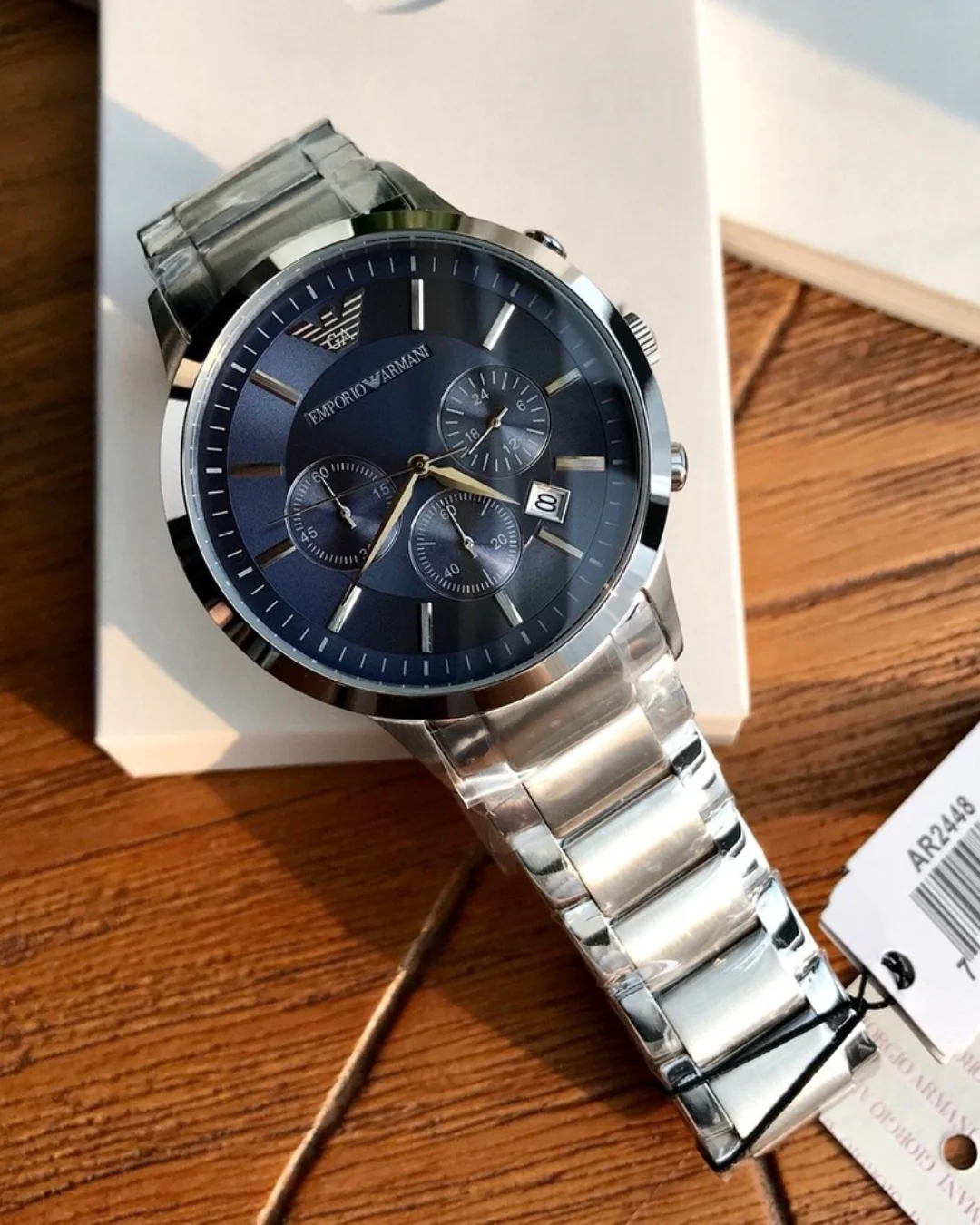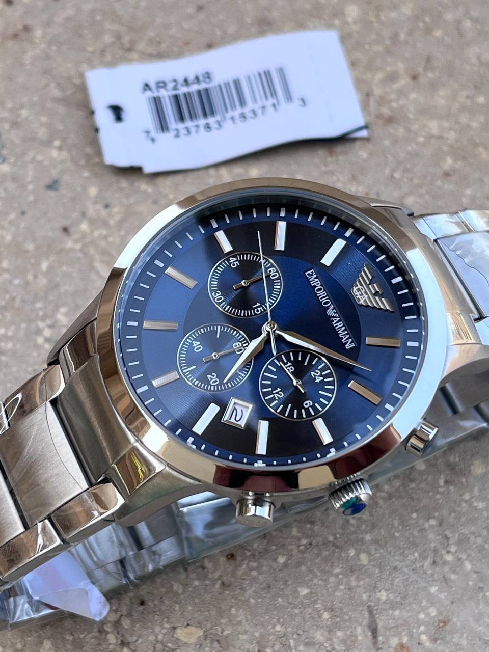 The watch features a sleek, modern design, featuring the Emporio Armani logo on the dark blue dial, which features white hour markers and polished metal needles. It has three subdials: one at 12 o’clock for the minutes, another at 3 o’clock for the hours, and a third at 6 o’clock for the seconds. There’s also a date window at 4 o’clock. The bezel and bracelet are made of brushed stainless steel, giving it a luxurious look. The code “AR2448” on the tag identifies the model, and it appears new with its original packaging.