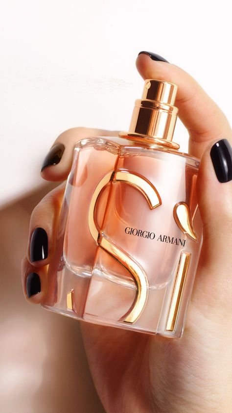 It comes in a transparent bottle that holds a warm peach liquid, topped with an elegant black stopper, adorned with the golden “Sì” logo, reflecting luxury and sophistication. The box, in a soft peach color with golden accents, reflects the essence of the fragrance: strong, irresistible femininity.