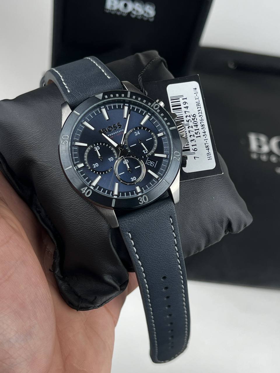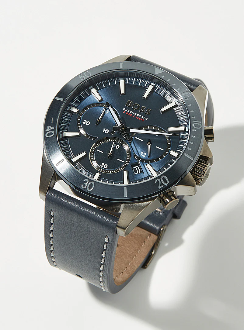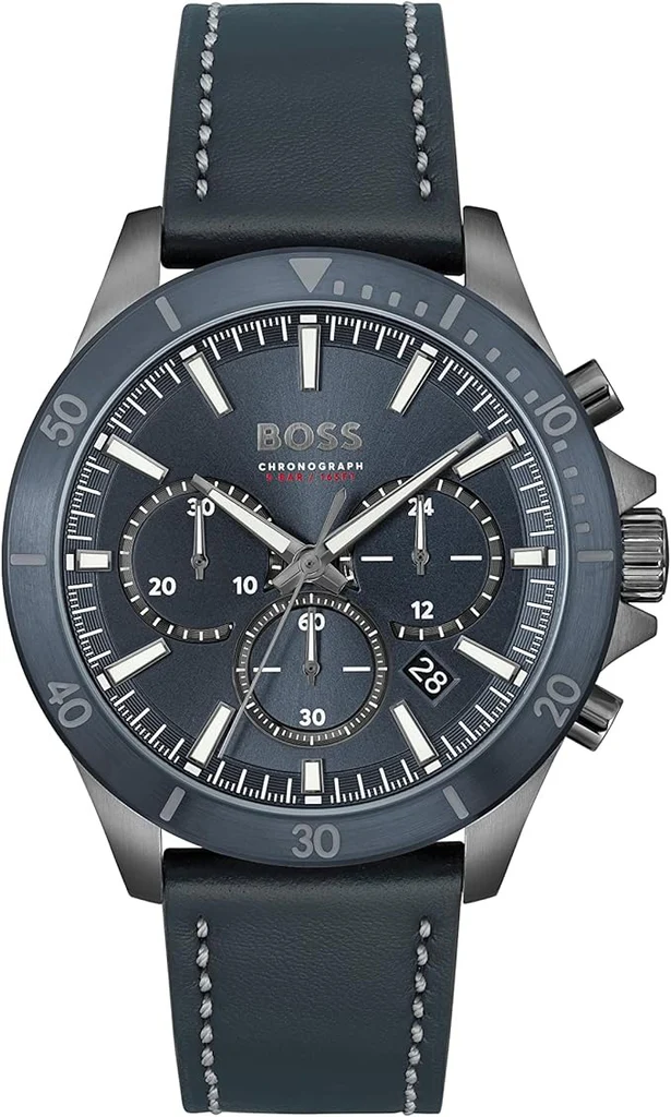 The HUGO BOSS watch features a sleek and functional design that reflects modern style. It features a silver-tone stainless steel case with a dark blue dial featuring three subdials that support the chronograph function, making it ideal for precise timekeeping. The strap is made of high-quality blue leather with distinctive white stitching, with a genuine leather interior for comfort. The watch is water-resistant to 5 bar (50 meters) and bears the “BOSS Chronograph” logo, adding a luxurious touch suitable for both everyday use and formal occasions.