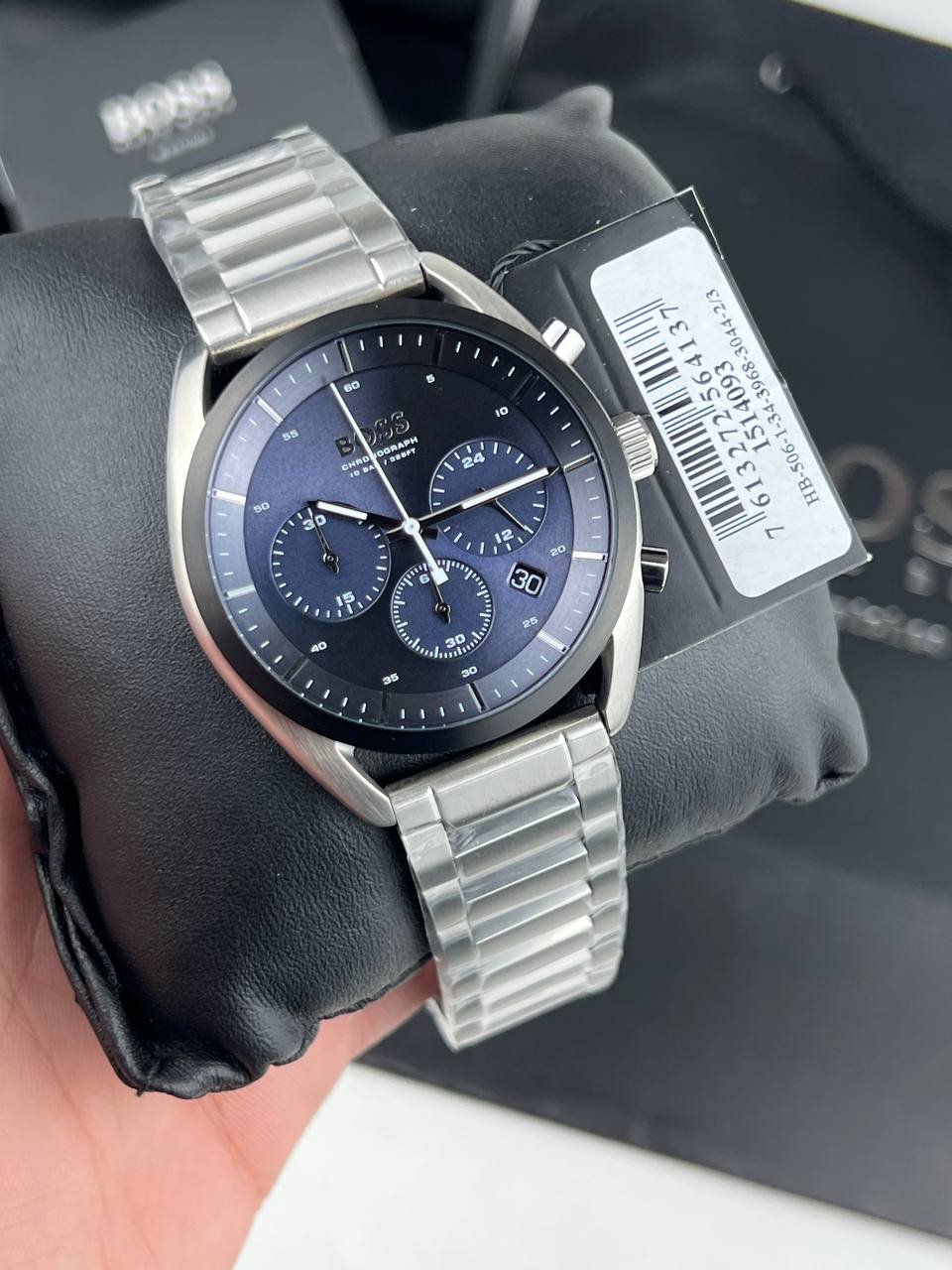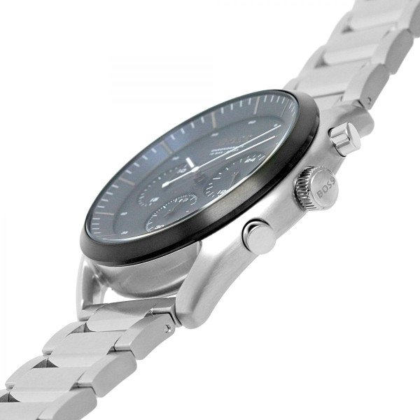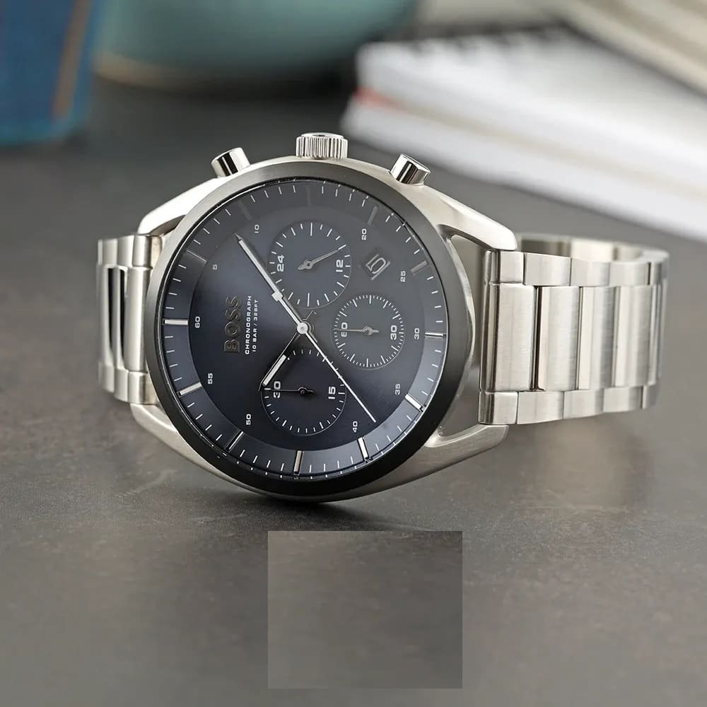 HUGO BOSS, featuring a silver metal case and a dark blue face featuring a triple-dials chronograph and date window. Equipped with a durable silver metal bracelet and water resistance to 5 bar, it’s ideal for everyday use.
