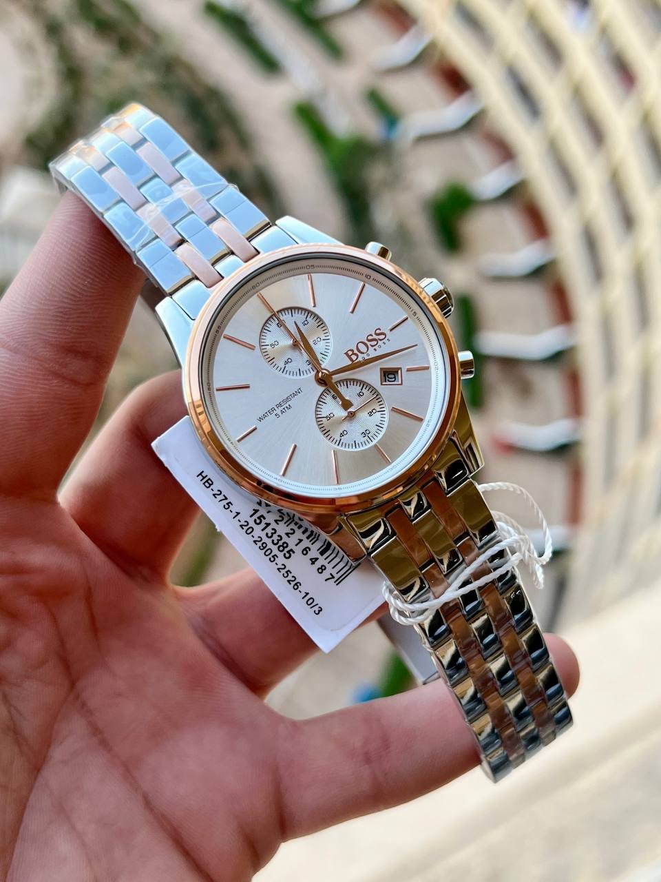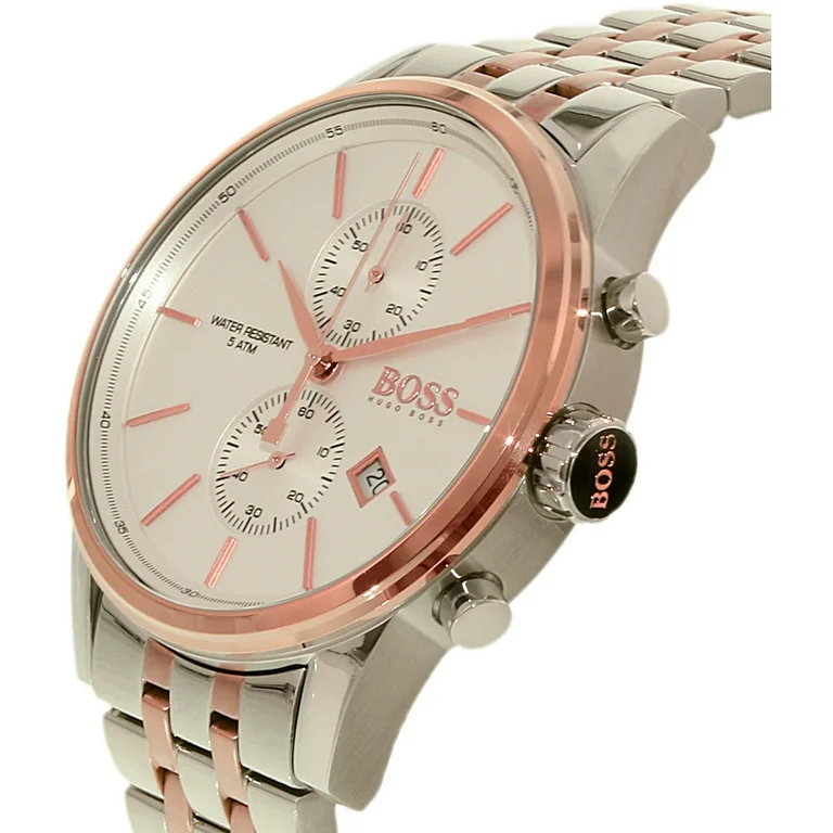 The HUGO BOSS features a refined, professional design that combines elegance with practicality. It features a two-tone (silver and rose gold) stainless steel case with a rose gold bezel, enhancing its luxurious appearance. The white face features three subdials supporting the chronograph function, a date window at 3 o’clock, and rose gold hands and indexes that clearly illuminate the face. The two-tone (silver and rose gold) metal bracelet offers exceptional durability and comfort. The watch is water-resistant to 3 ATM (30 meters), making it suitable for everyday use while maintaining performance in simple conditions. The overall design reflects high quality and is suitable for both formal and casual occasions.