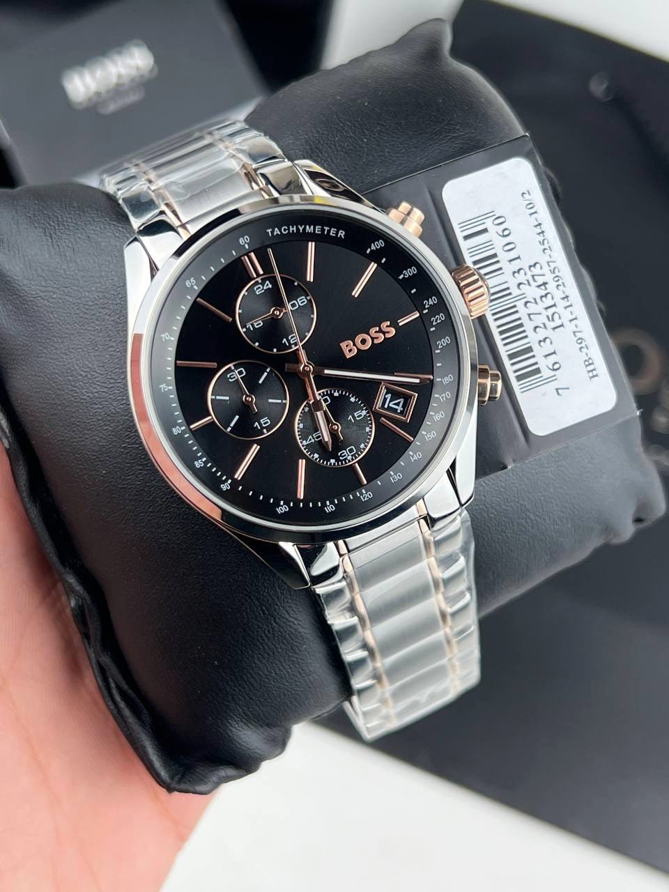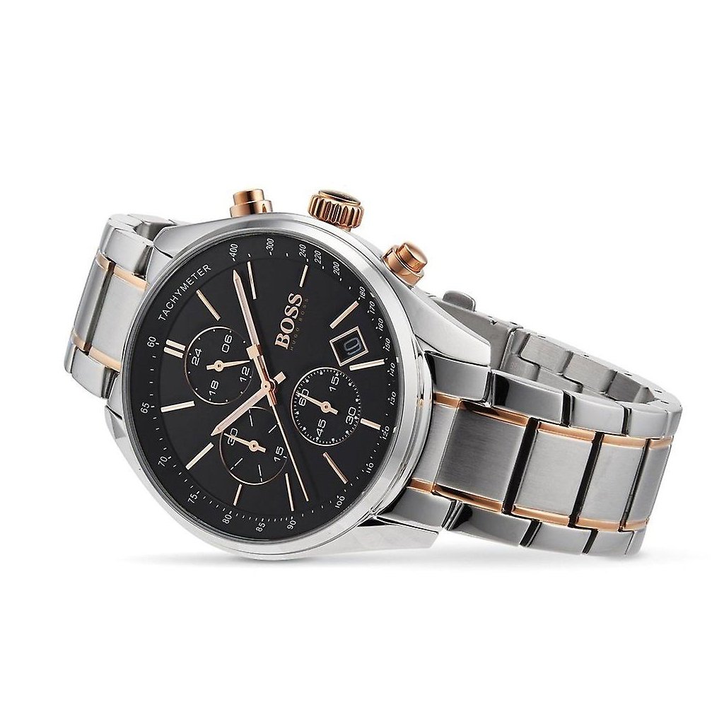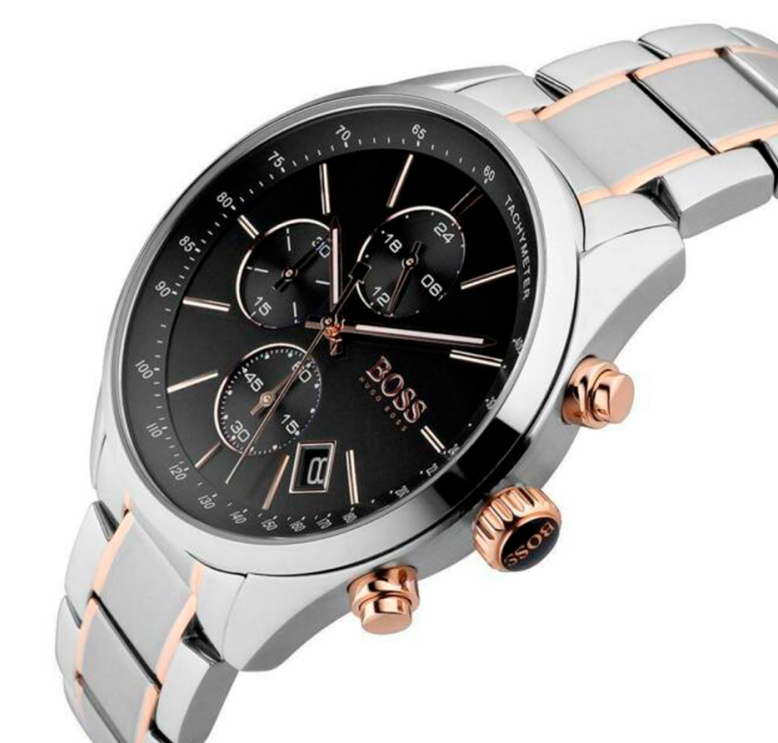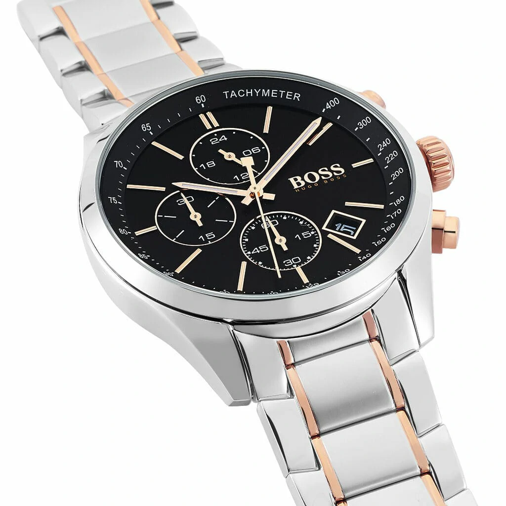 The HUGO BOSS watch features a sleek, modern design. It features a two-tone (silver and rose gold) stainless steel case with a black bezel featuring a tachymeter. The black face houses three subdials supporting the chronograph function, a date window at 3 o’clock, and rose gold-tone hands and markers that illuminate the face. The two-tone (silver and rose gold) metal bracelet offers durability and comfort, making it suitable for both everyday use and formal occasions.