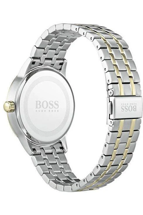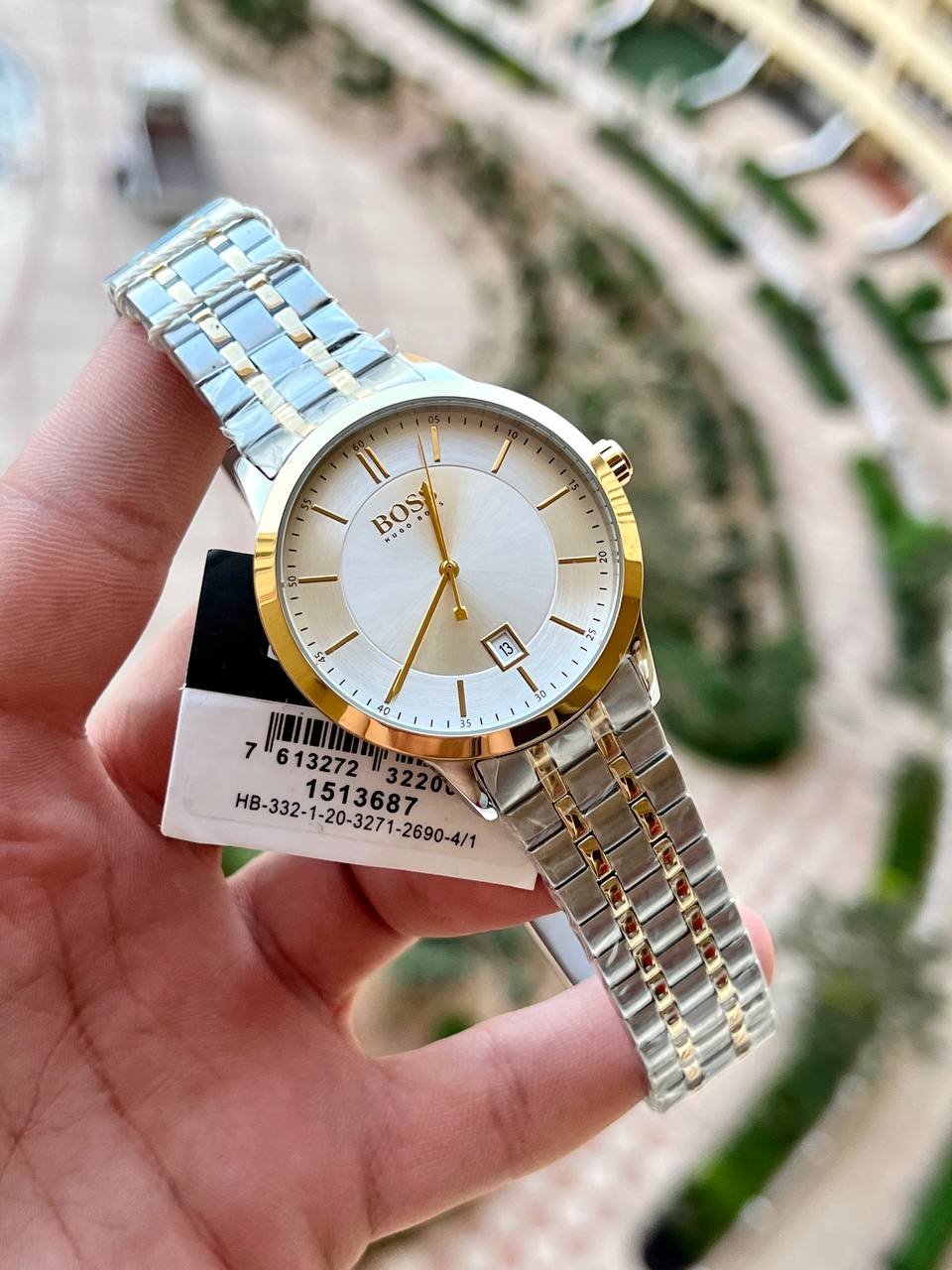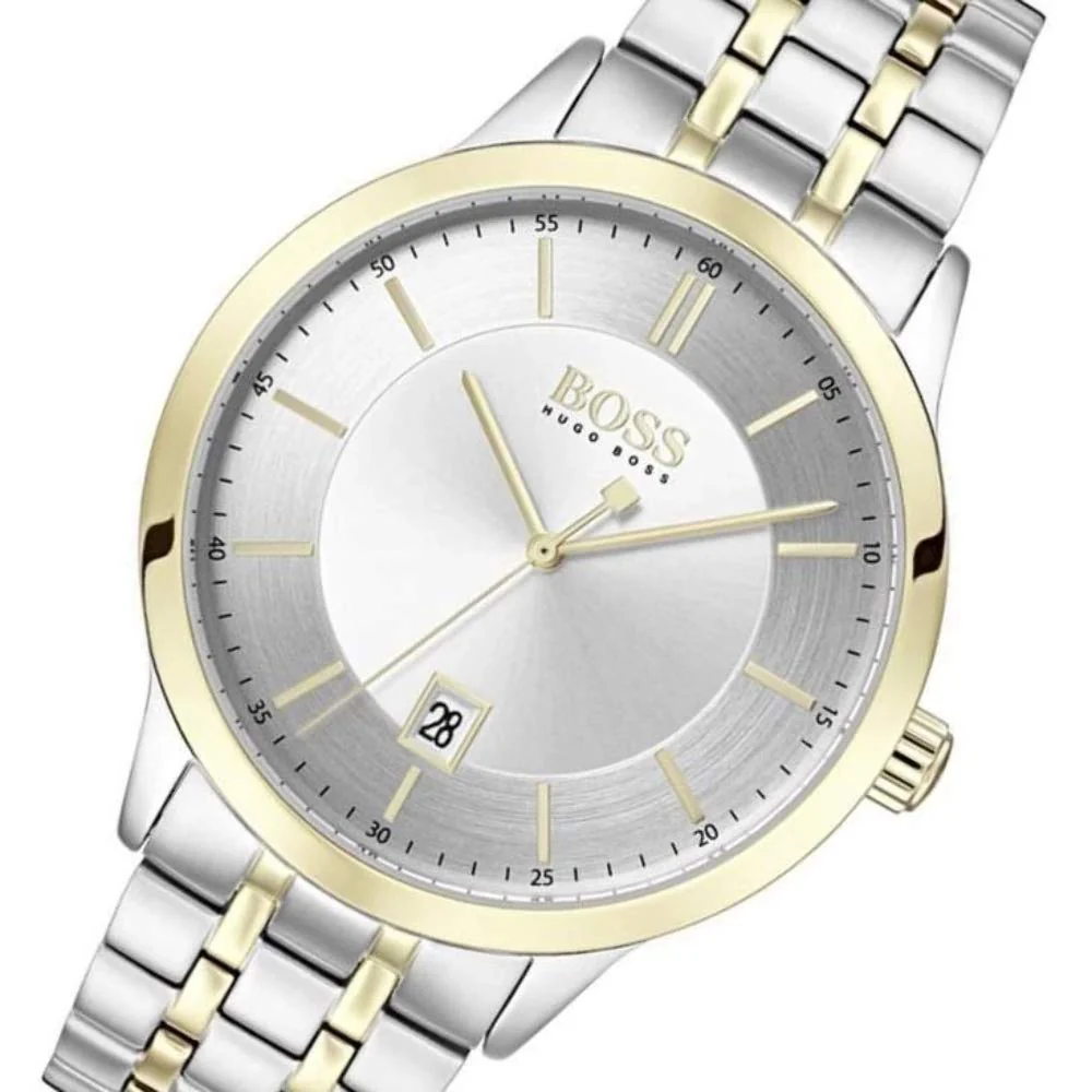 The HUGO BOSS watch features a classic, elegant design. It features a two-tone (silver and gold) stainless steel case with a gold-tone bezel that enhances its luxurious appearance. The white face features a date window at 3 o’clock, and black hands and indexes illuminate the face clearly. The two-tone (silver and gold) metal bracelet offers comfort and durability, making it suitable for both everyday use and formal occasions.