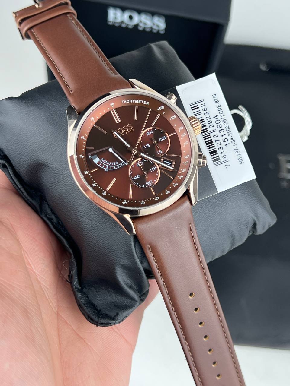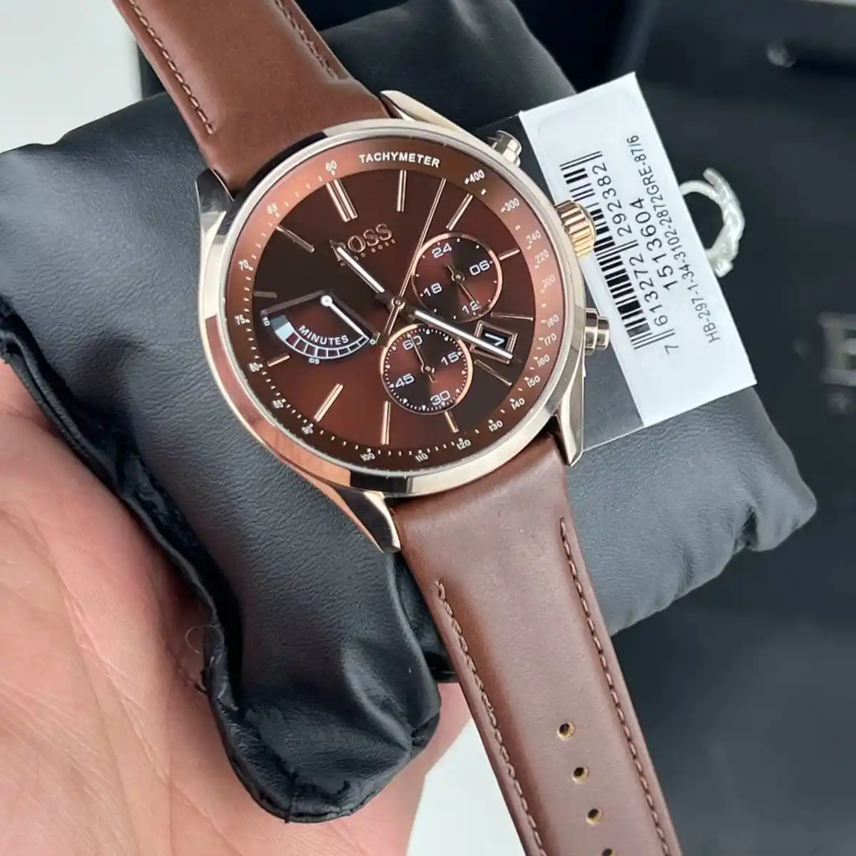 – Display: The watch is placed on a black cushion inside a BOSS-branded box, enhancing the luxurious presentation experience.