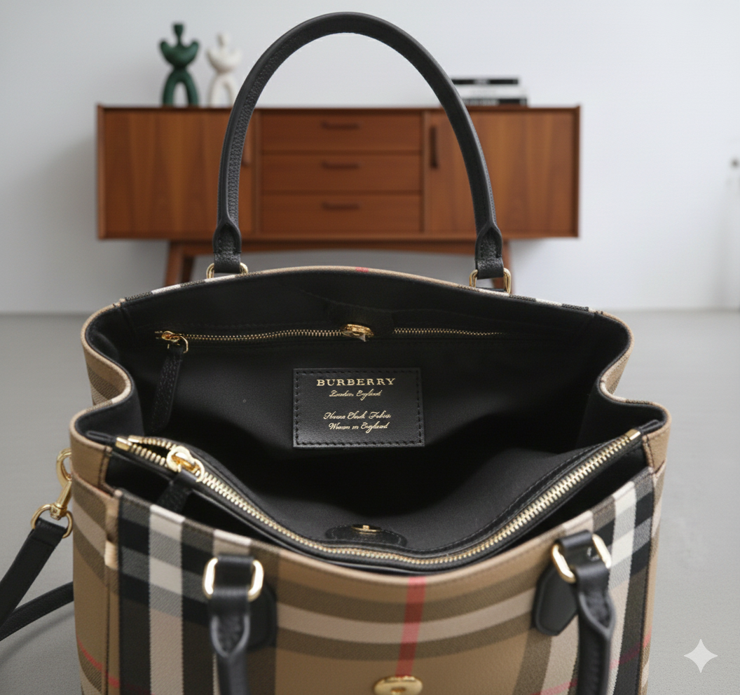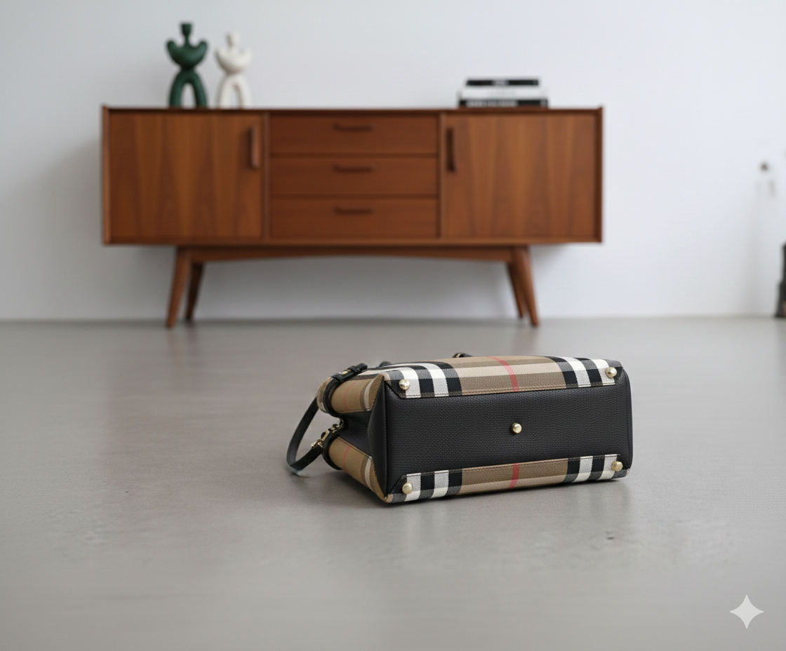 Visual Identity: The distinctive check pattern is Burberry’s unmistakable signature, reflecting the house’s rich British heritage and giving the bag a timeless appeal.