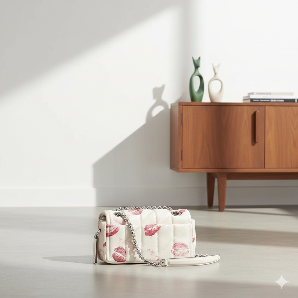 Elevate your look with the “Kiss of Chic” bag, where classic design meets contemporary elegance. Crafted from luxurious white leather with quilted details that add sophisticated visual depth, it’s adorned with vibrant pink kiss prints that lend it a bold and feminine touch.