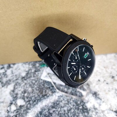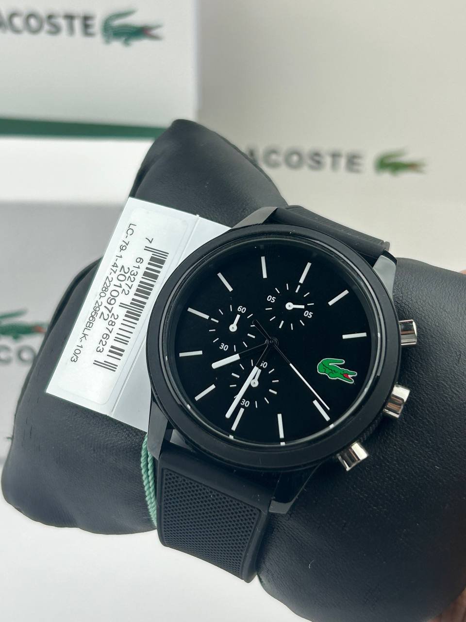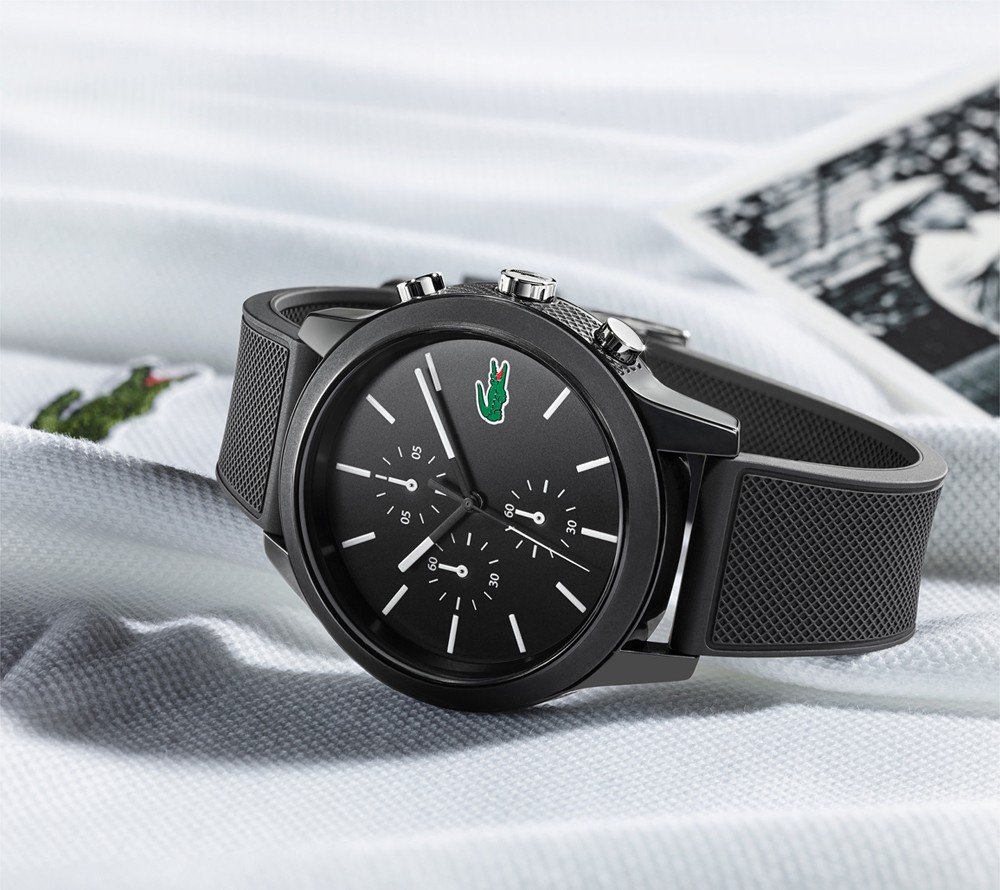 – Logo: The green and red LACOSTE crocodile is prominently displayed at the top of the dial, a symbol of sporty identity and French elegance.