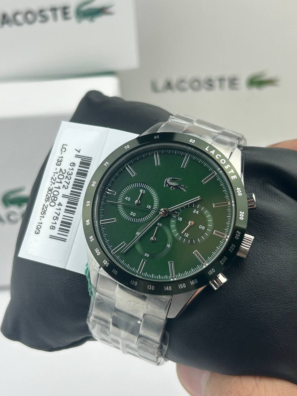It features three minute subdials and a bezel with tachymeter indicators that give you a sense of speed and precision, while the iconic crocodile logo stands out as a signature of refined French taste.