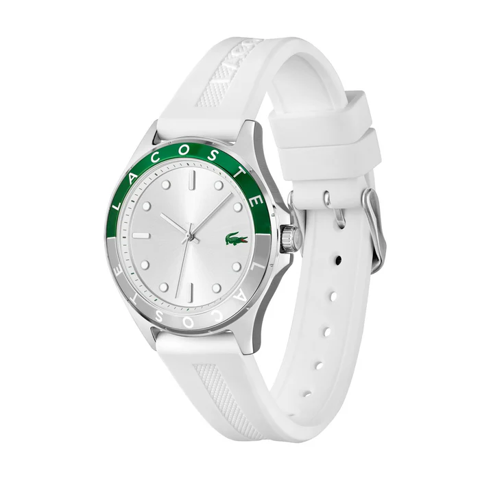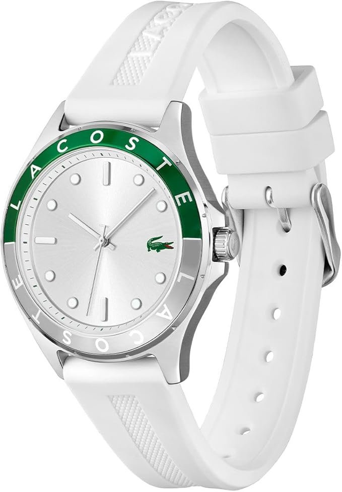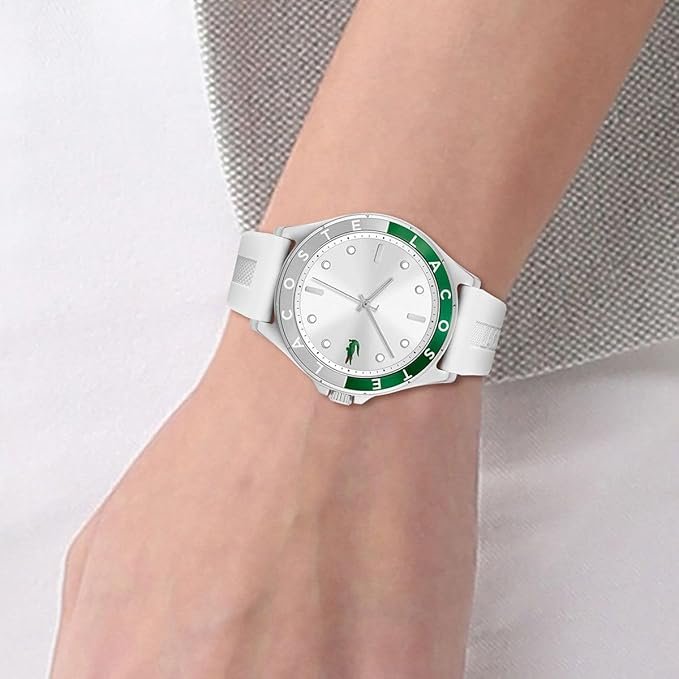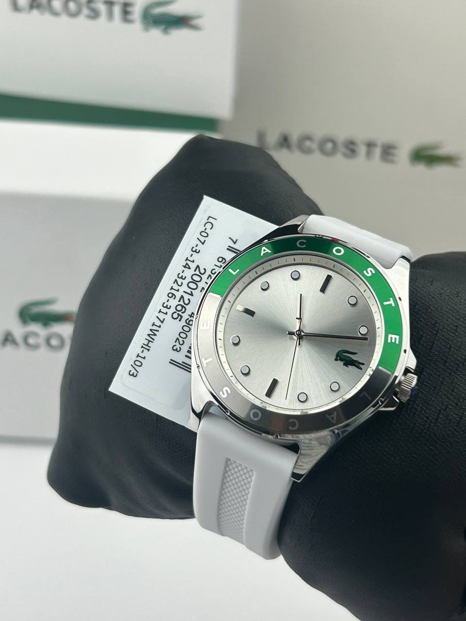 It features an elegant silver dial surrounded by a green ring bearing the “LACOSTE” signature, an attractive visual contrast that catches the eye without being overly pretentious.