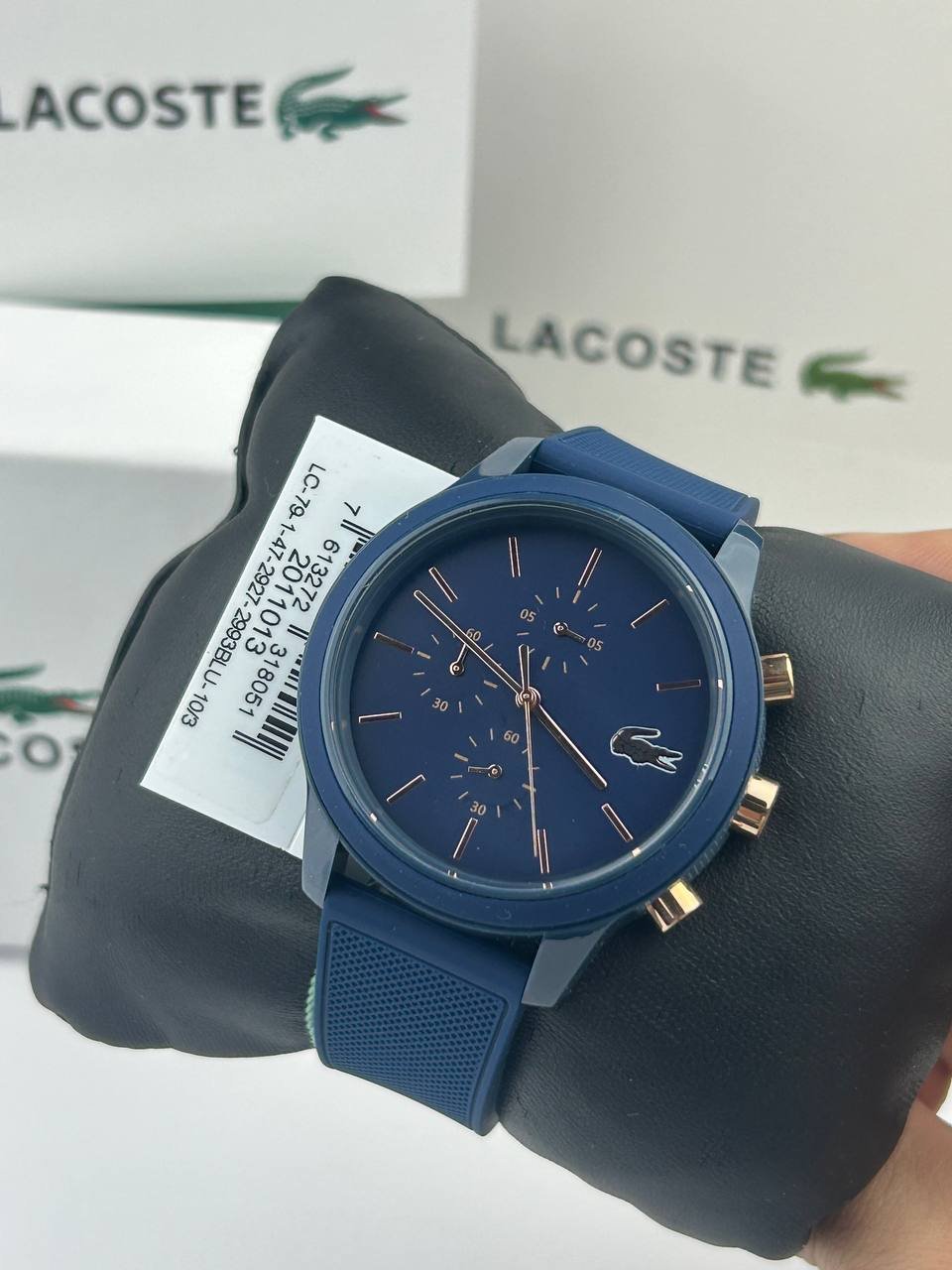 The iconic crocodile logo adorns the dial with a confident look, while the LACOSTE name stands out on the bezel, affirming the watch’s luxury identity.