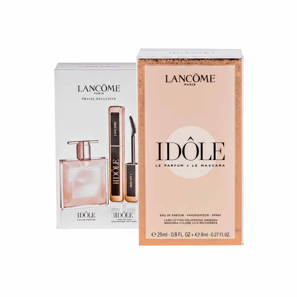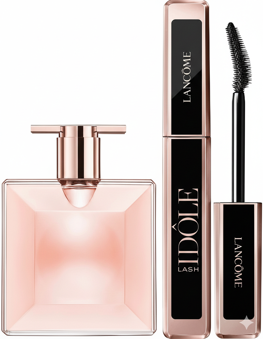 The Lash Idôle mascara packaging is shown alongside the curved brush designed to lift and thicken lashes, with the product name clearly printed in the brand’s original font.