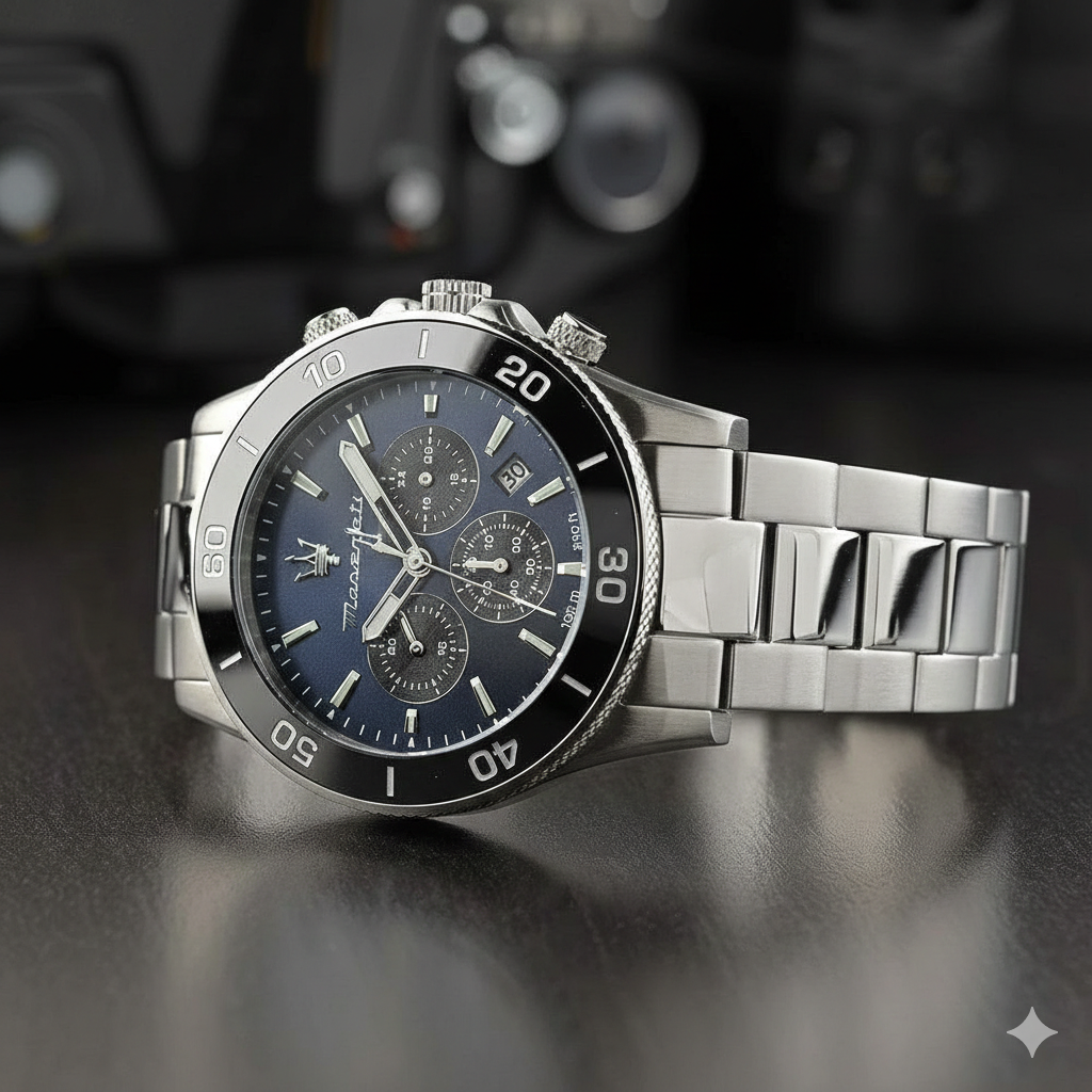 The watch features a sleek, deep blue dial housing three subdials with precise chronograph functions, along with a practical date window that adds a touch of organization and professionalism. Luminous hands and markers provide optimal legibility even in low light, while the rotating bezel with its precise indices adds a sporty, sophisticated touch.