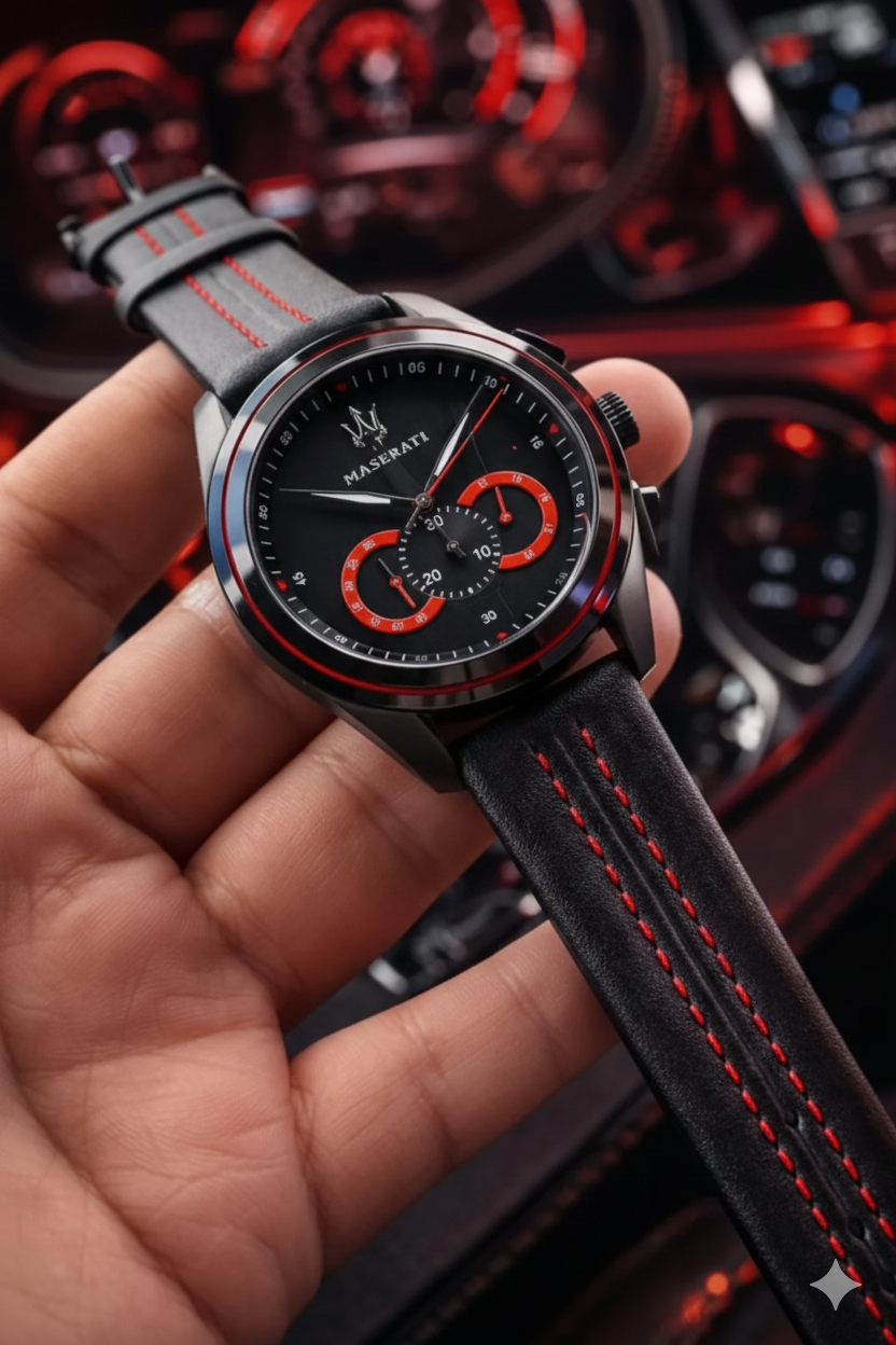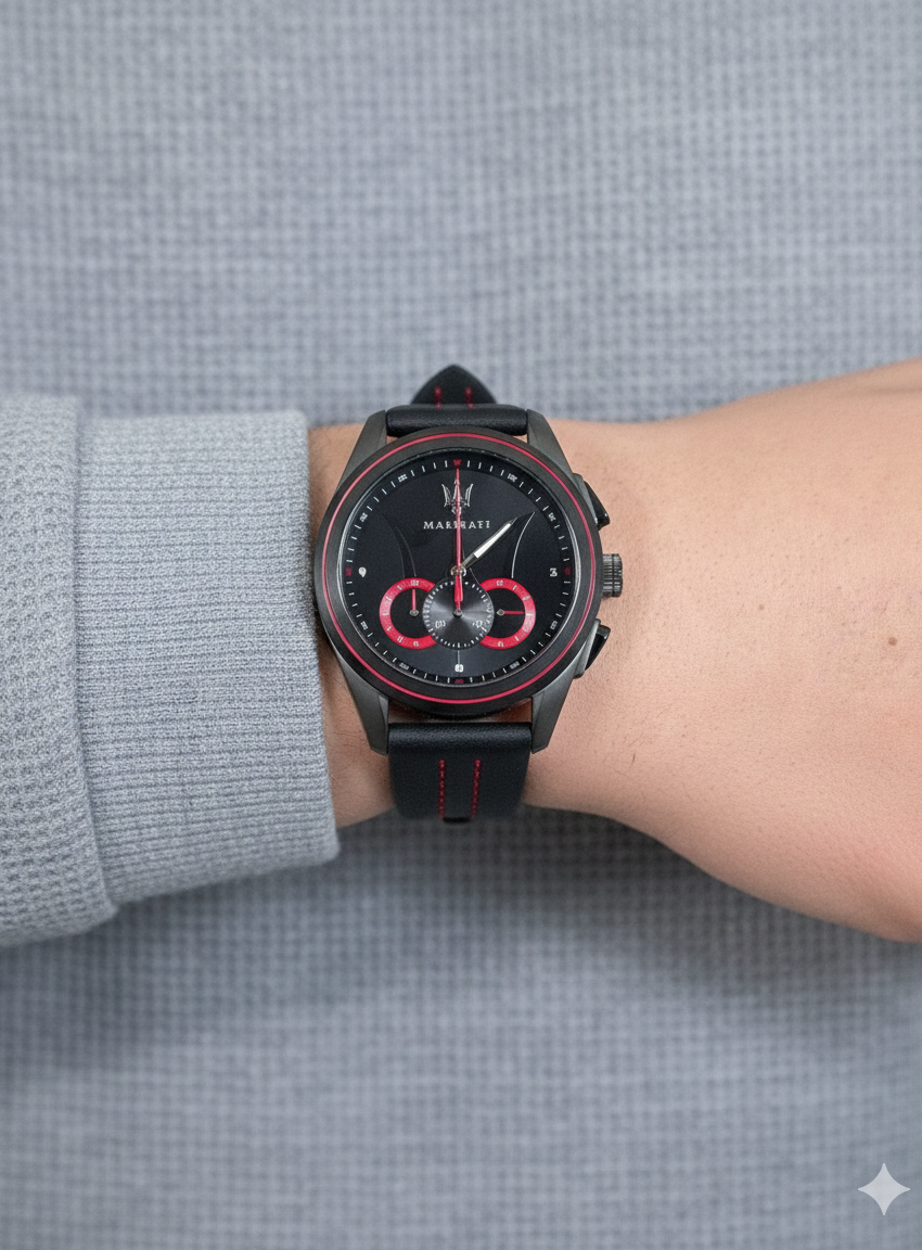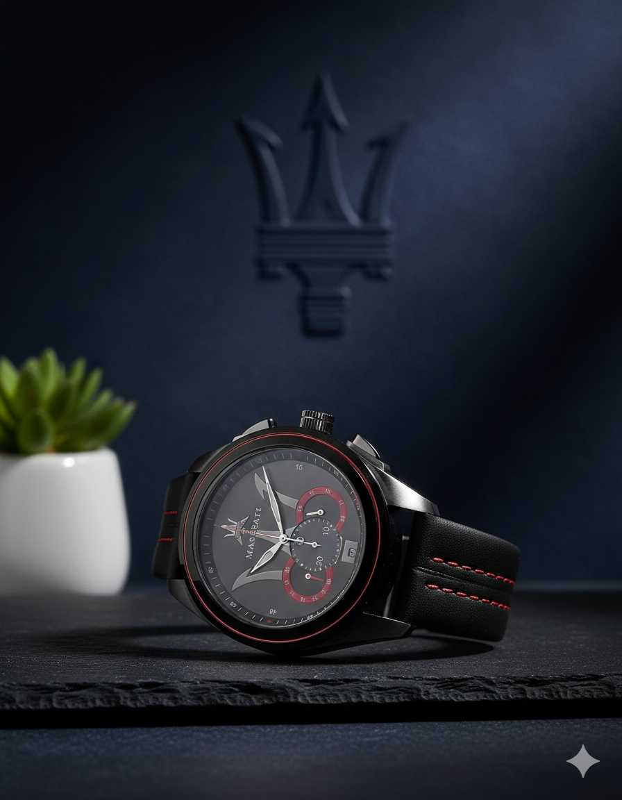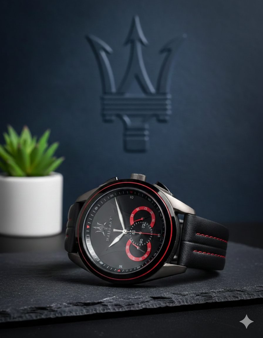 The iconic *Maserati* tricolor logo adorns the dial, a clear signature of Italian luxury, making this watch a statement piece wherever you go.