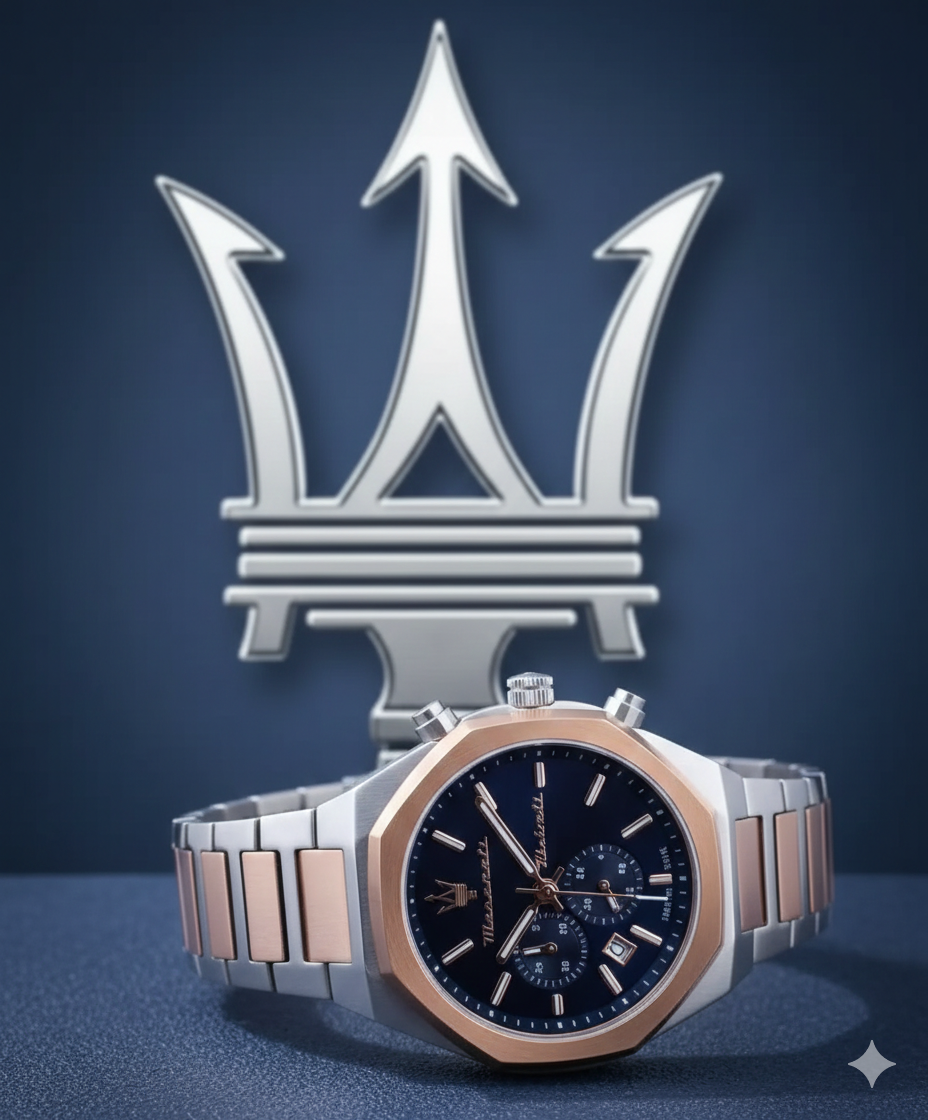 The iconic *Maserati* tricolor logo adorns the dial, a clear signature of Italian craftsmanship, while the elegant presentation case, bearing the brand’s identity, completes the look, making this watch an ideal gift or a piece of art to wear with confidence.