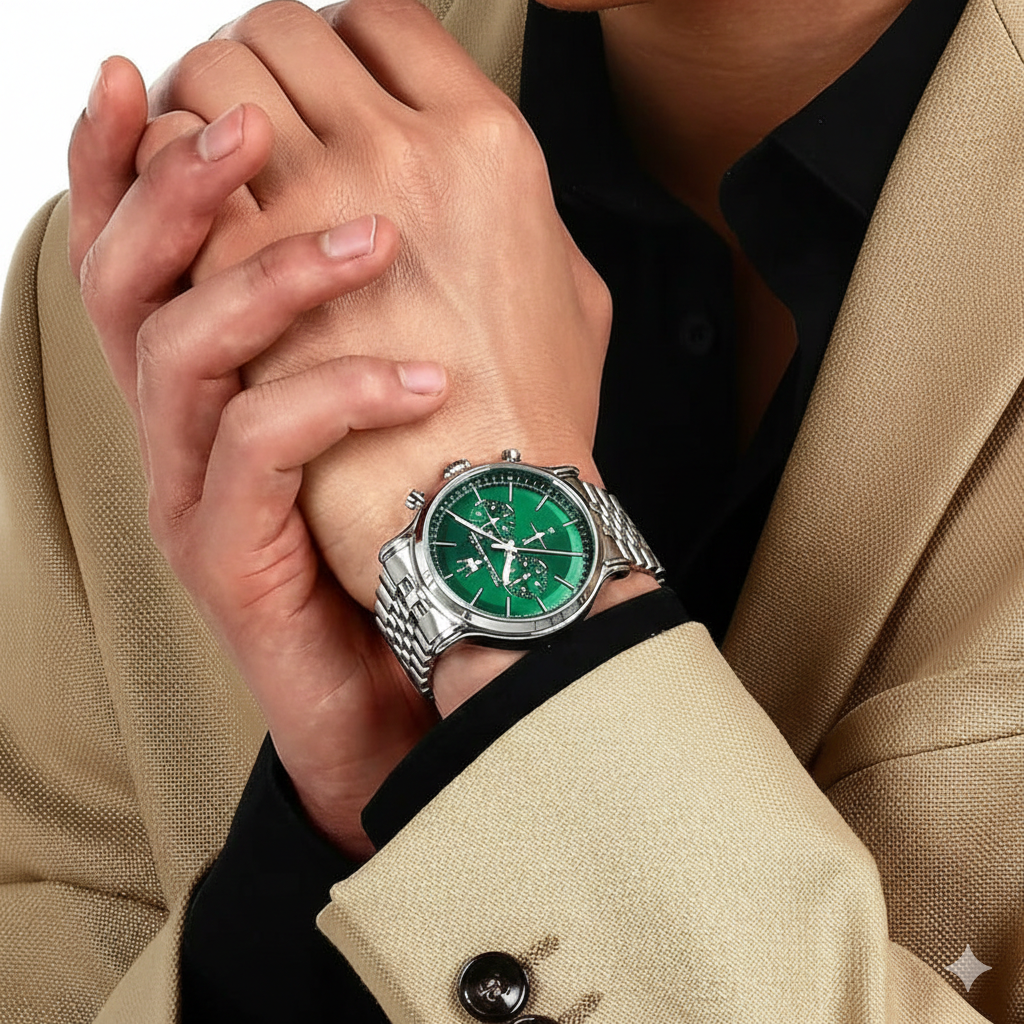 The watch features an attractive dark green dial housing three subdials with precise chronograph functions, and clear white hour markers for perfect readability at every moment.