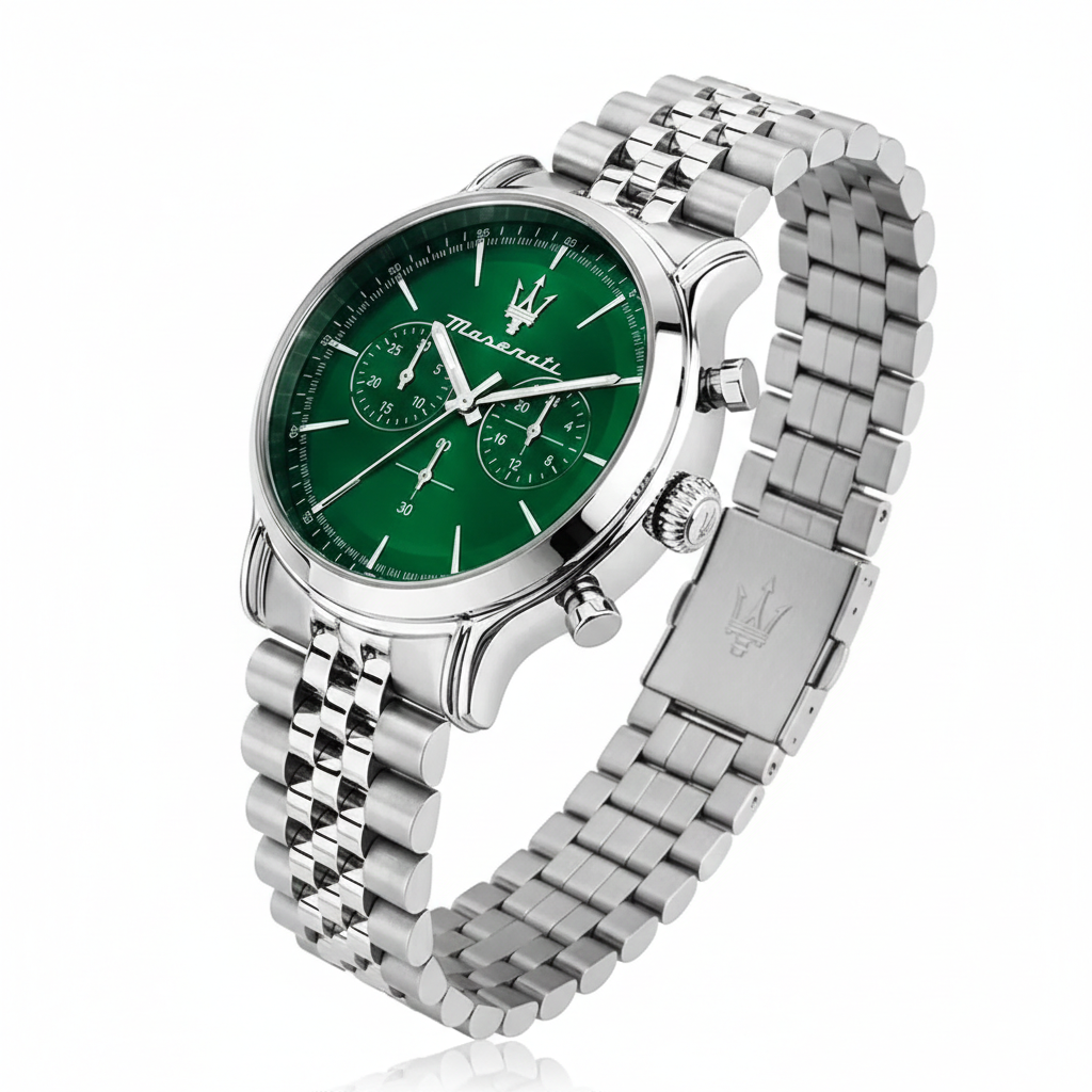 Silver hands harmonize with the design, while the polished metal bracelet adds a touch of classic sophistication, finished with a clasp bearing the iconic *Maserati* triple logo, a signature of Italian craftsmanship. The polished steel case reflects light beautifully, enhancing the watch’s presence as a work of art to be worn with confidence.