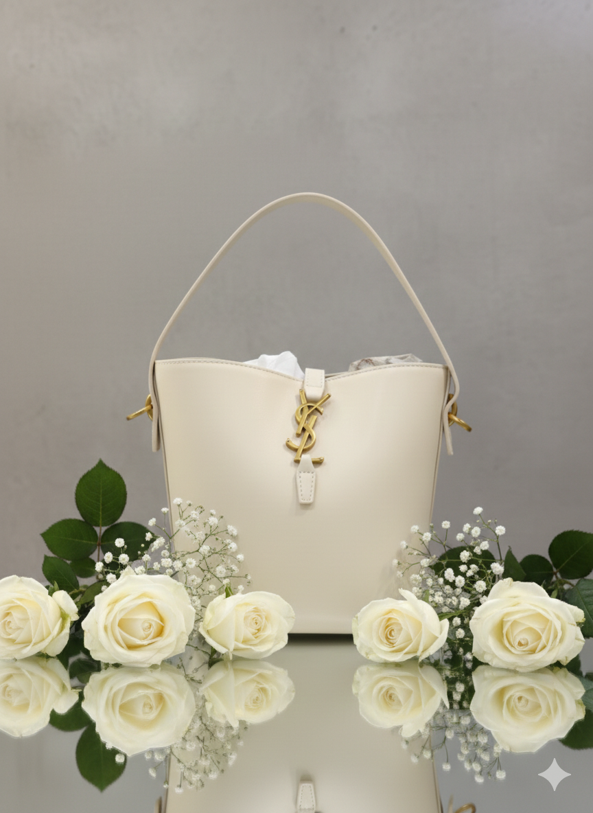 Metal Details: The gold YSL logo shines on the front of the bag, creating a captivating contrast with the light leather, reinforcing the piece’s identity as a creation of the French fashion house.