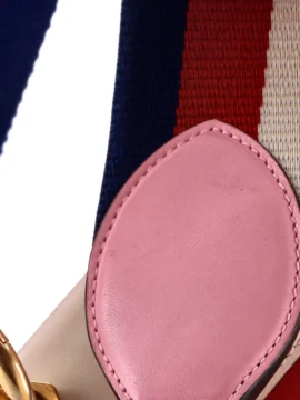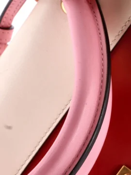 This bag boasts a sleek, geometric design that blends boldness and sophistication. Its semi-pyramidal shape is coordinated in white, red, and navy, with a pink top handle adding a touch of soft femininity. A detachable shoulder strap in vibrant, interwoven colors enhances its modern appeal, making it suitable for a variety of looks.