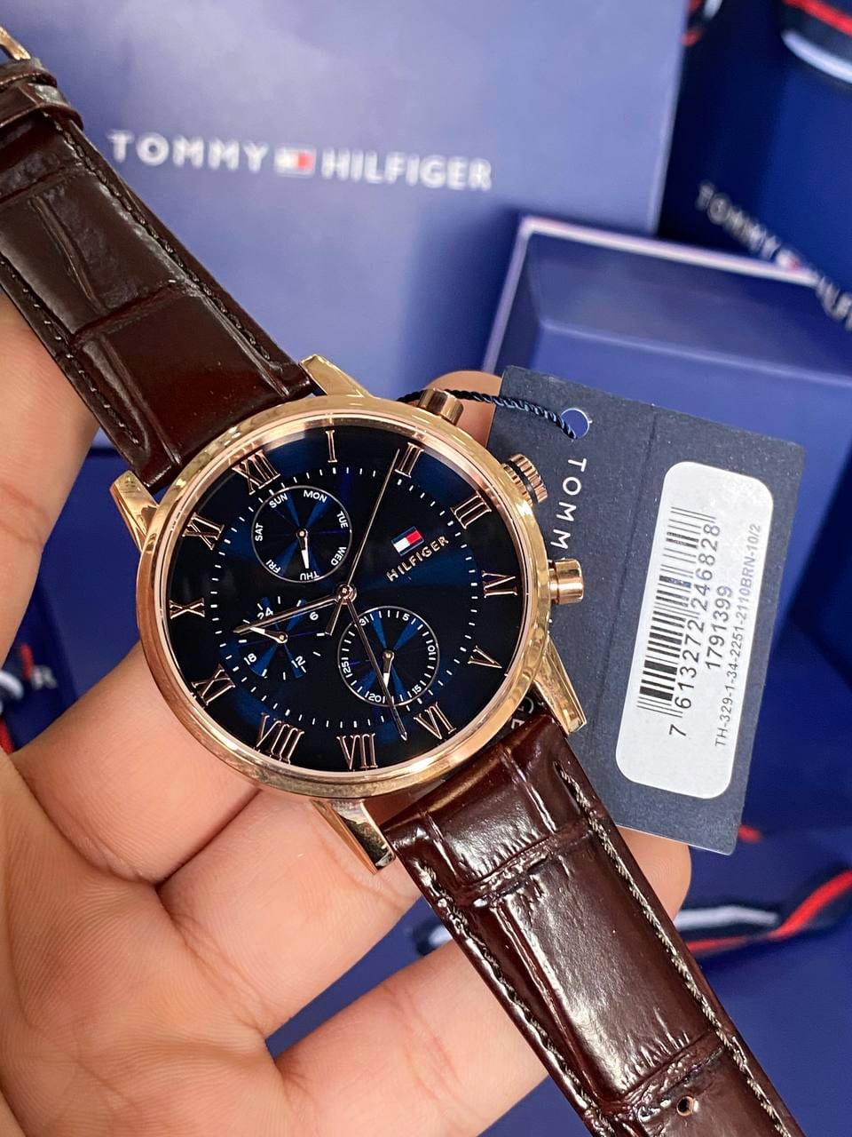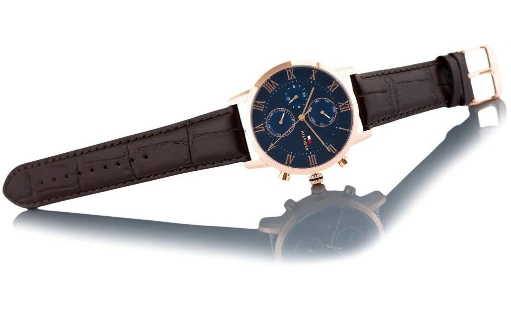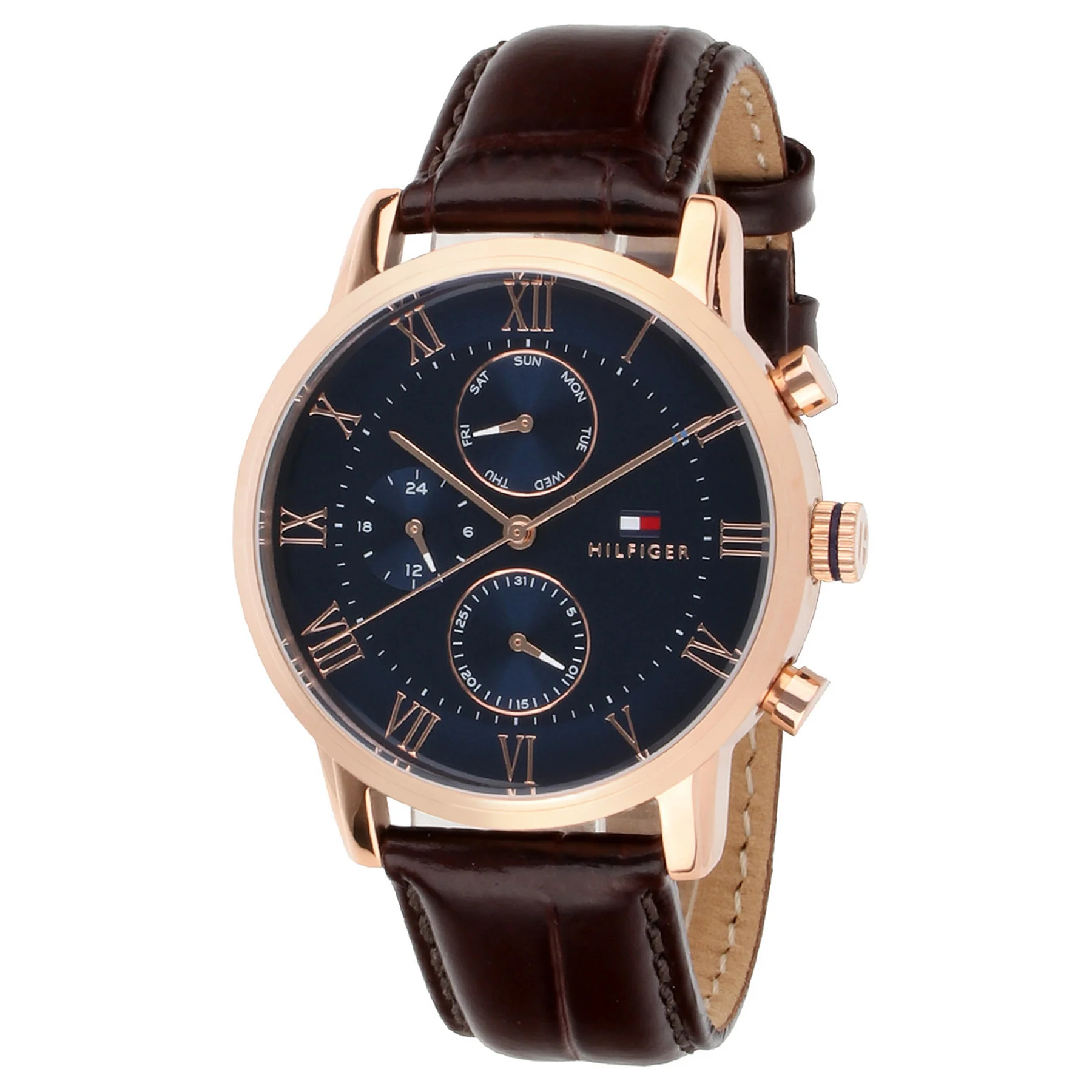 The HILFIGER logo is printed in white below 12 o’clock, flanked by the brand’s tricolor flag.