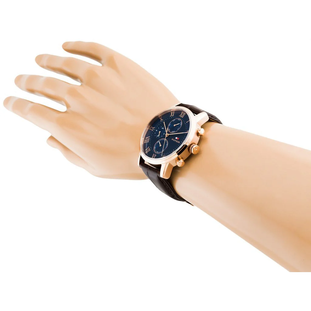 This men’s watch combines classic design with modern details, combining royal black with rose gold and a luxurious brown leather strap, creating a piece that exudes refined taste and confidence.