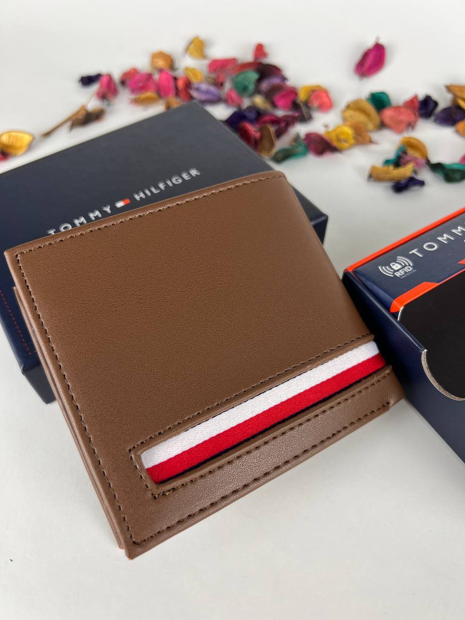 – Decorated with a tricolor horizontal stripe (white, red, and brown) in a visual contrast that reflects the iconic Tommy Hilfiger signature.