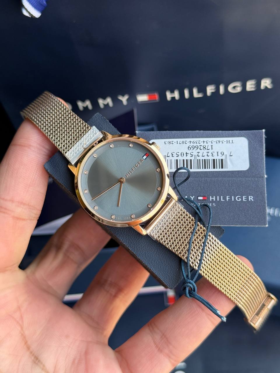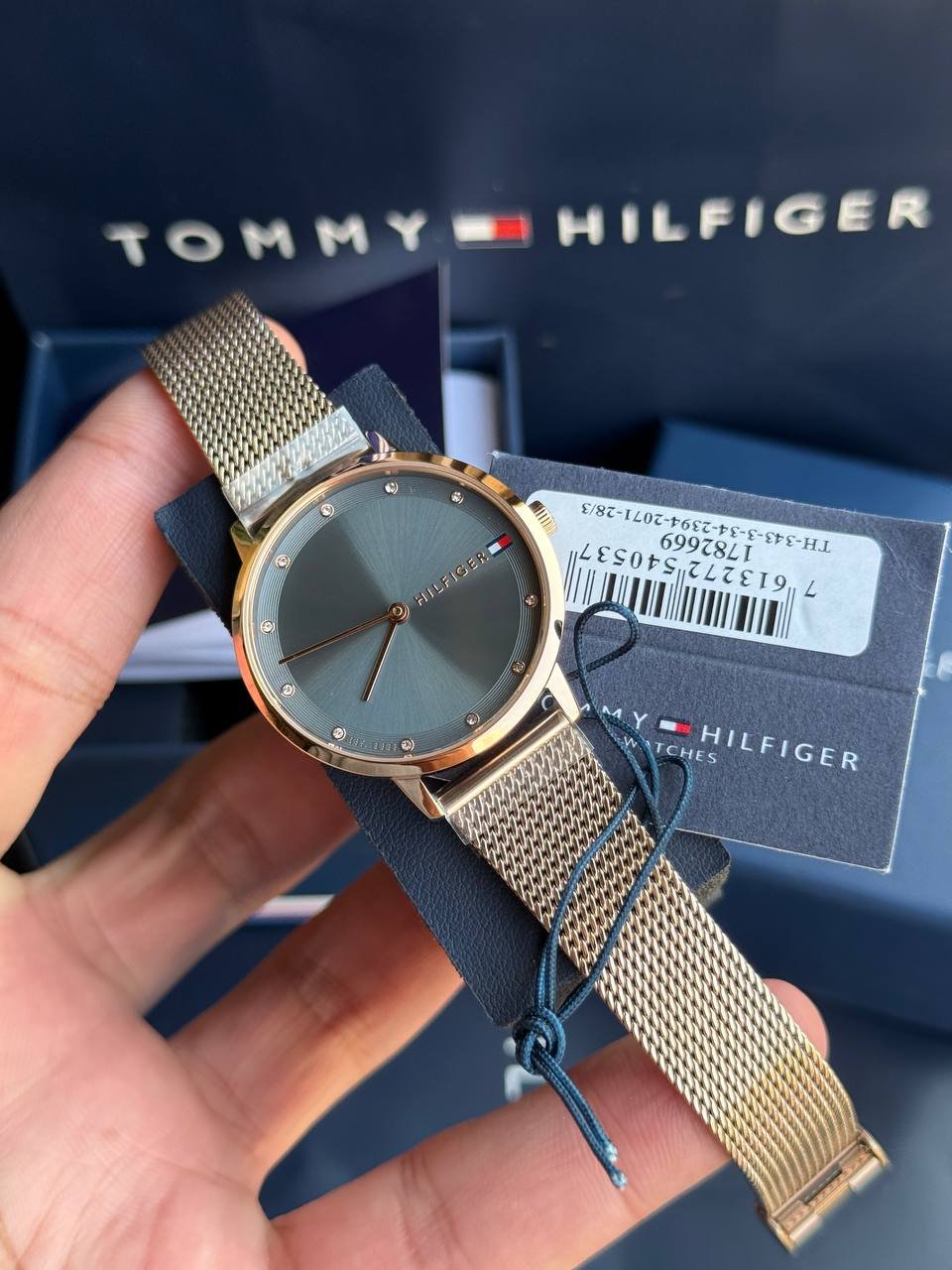 The iconic Tommy Hilfiger logo adorns the dial, emphasizing the brand’s global identity.