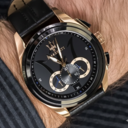 Maserati Men’s Chronograph Watch – Black Dial, Rose Gold Bezel, Leather Strap