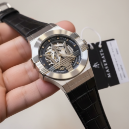 Maserati Men’s Automatic Skeleton Watch – Silver Case, Black Leather Strap